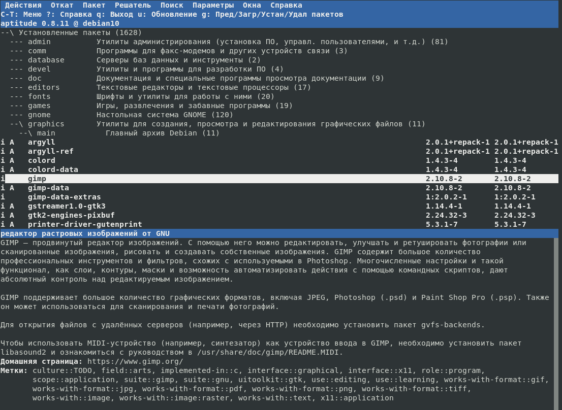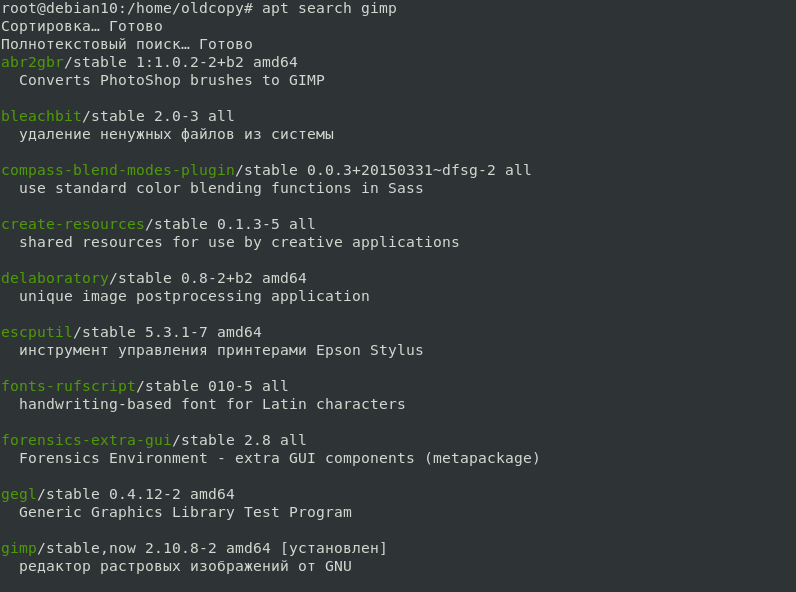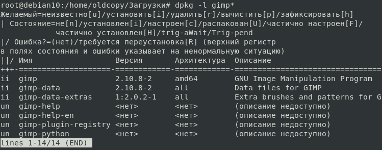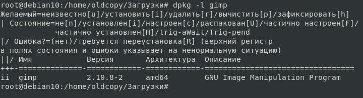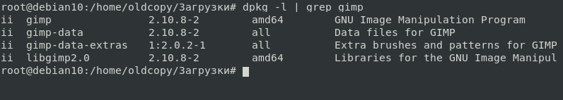 Теперь мы видим больше пакетов, как установленных в системе, так и доступных в репозитории. Но это не все пакеты, относящиеся к gimp, так как наша маска предписывает искать пакеты, которые начинаются на gimp и игнорирует иные варианты. Поэтому, если вы не уверены, что правильно задали маску, можно пойти другим путем, отдав вывод dpkg команде grep, которая найдет все нужные вхождения.
