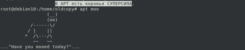 Объем данной статьи не позволяет рассмотреть все возможности apt, поэтому мы ограничились наиболее необходимыми в повседневной деятельности, ну и в завершение небольшая порция юмора. Если запустить команду apt без параметров, то вы увидите краткую справку в самом конце которой будет строка: В APT есть коровья СУПЕРСИЛА. Что это значит? Просто наберите:
