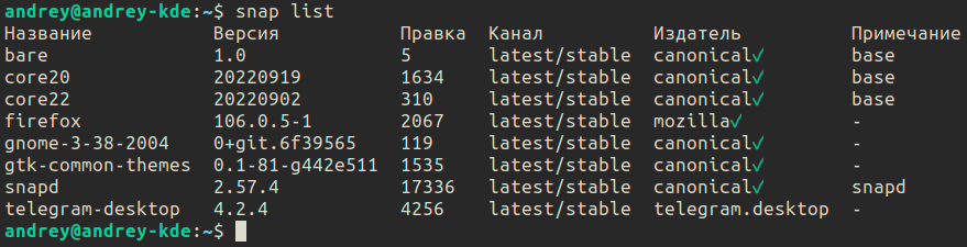 Посмотреть на список установленных snap можно командой: