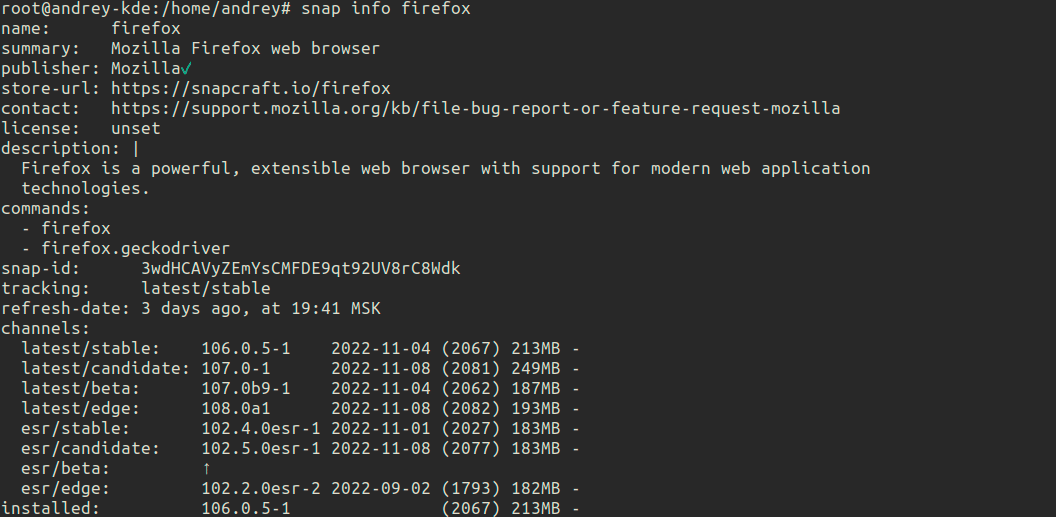 Как можем увидеть, доступны два выпуска: latest и esr, каждый со своими уровнями риска. В поле tracking указан текущий канал - latest/stable, а в поле installed - установленная версия, если, конечно, пакет установлен.