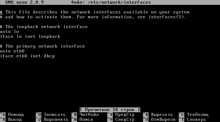 Эта команда откроет в консольном редакторе nano конфигурационный файл с сетевыми интерфейсами, аналогичный рисунку ниже.