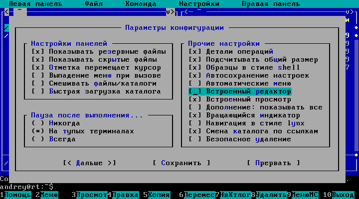 Для запуска Midnight Commander достаточно набрать в консоли его краткое имя: mc. Сразу рекомендуем включить встроенный редактор, более удобный чем nano: F9 - Настройки - Конфигурация - Встроенный редактор.