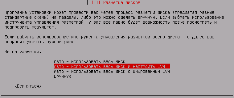 Самый простой способ начать использовать LVM - это настроить его при установке системы, для этого следует выбрать соответствующий пункт в меню разметки диска: