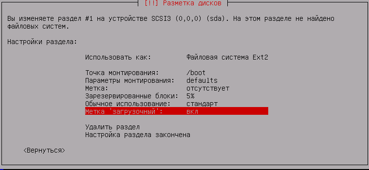 Поэтому сразу создадим в самом начале диска первичный раздел размером не менее 250 МБ (а лучше 500 МБ) с файловой системой ext2 и точкой монтирования /boot, не забываем отметить раздел как загрузочный.