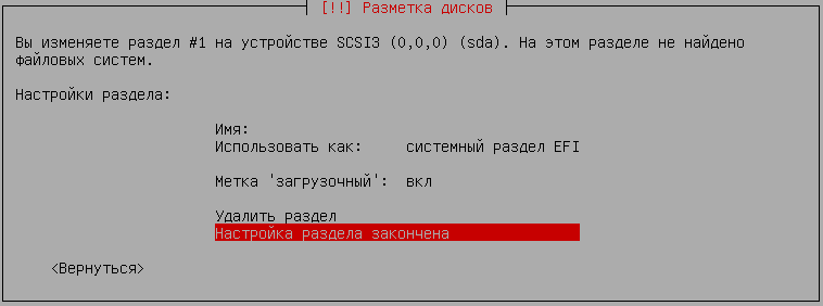 Для EFI разметки следует создать первичный радел размером 499 МБ с типом системный раздел EFI, метка загрузочный будет установлена автоматически: