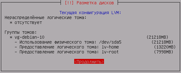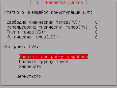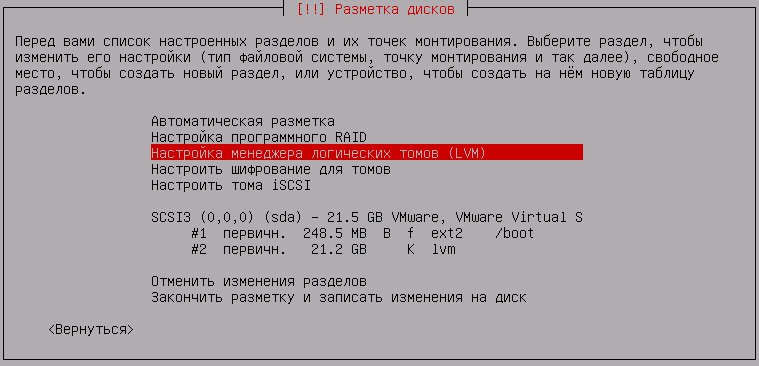 Создав загрузочный раздел можно приступать к настройке LVM, для этого выберите Настройка менеджера логических томов (LVM):
