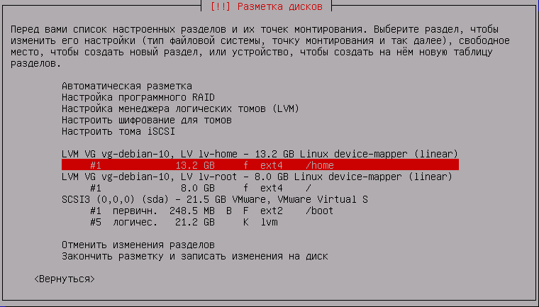 Ниже мы будем рассматривать разметку, созданную автоматически с выделением /home в отдельный раздел.
