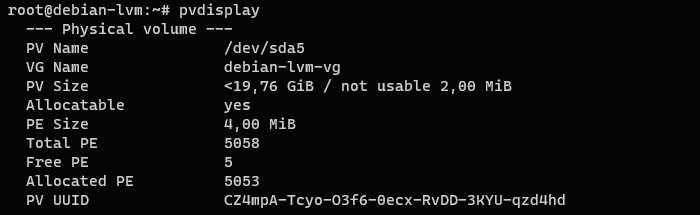 Вас может удивить необычный размер физического тома <19,76 ГБ, с припиской о неиспользуемых 2 МБ. Но в этом нет ничего необычного, если вспомнить, что физический том в LVM - это набор физических экстентов указанного размера и использовать пространство меньше размера экстента не представляется возможным.