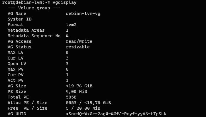 Здесь мы увидим немного больше информации, кроме размера группы томов и количества физических экстентов в ее составе также указано количество логических и физических томов в группе.