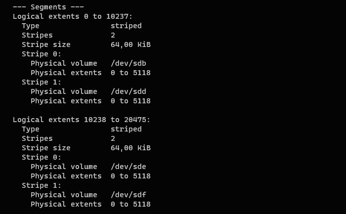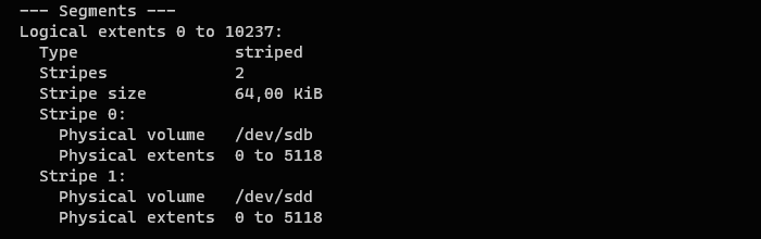 Данный том состоит из единственного сегмента занимающего логические экстенты от 0 до 10237, которые отображаются в две полосы чередования с размером блока чередования в 64 КБ, этот сегмент отображается на физические экстенты 0 - 5118 каждого из физических томов.