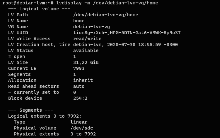 1lvdisplay -m /dev/debian-lvm-vg/home