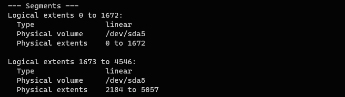 Посмотрим информацию о логическом томе, в частности нас будут интересовать сведения о сегментах. Для получения этой информации запустите команду lvdisplay с ключом -m.