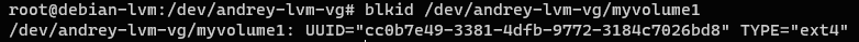 1blkid /dev/andrey-lvm-vg/myvolume1