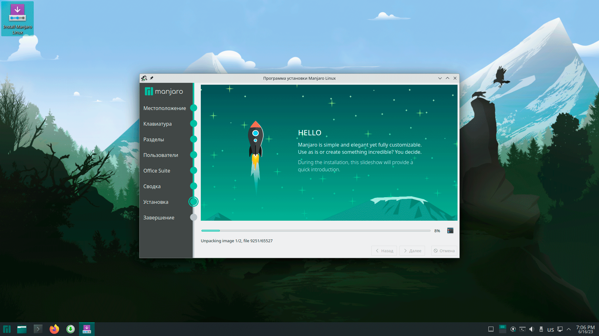 После того как вы ответите на все вопросы начнется установка, до этого момента вы всегда можете вернуться назад и изменить свой выбор. Во время установки можете сходить сварит кофе, к вашему возвращению система должна быть установлена, ну либо можете посмотреть на слайды с ракетой.