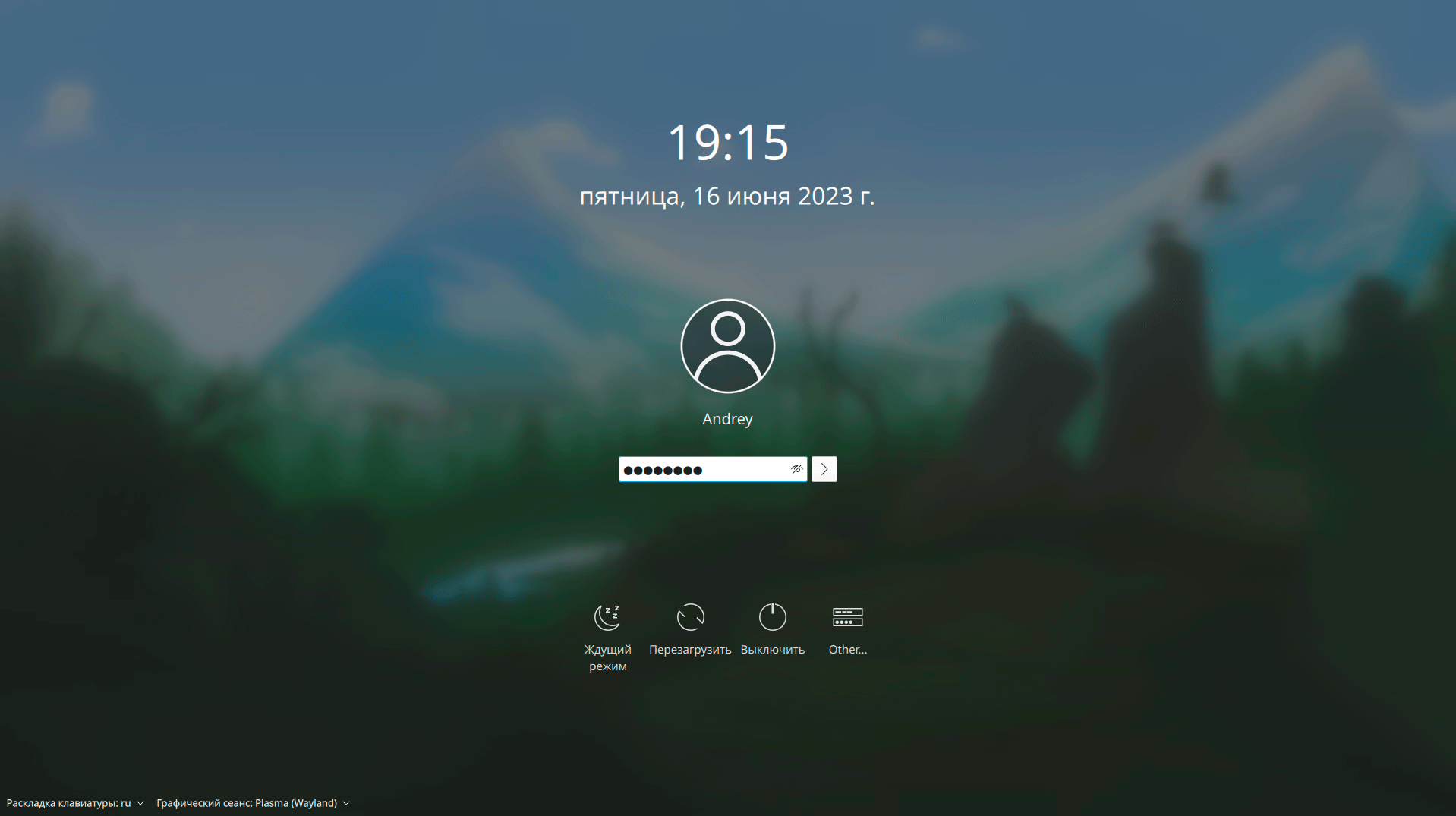 После перезагрузки вас встретит окно входа в систему, стандартное для KDE Plasma, никаких особенностей тут нет. Все корректно работает, языки переключаются, в качестве графического сервера используется Wayland.