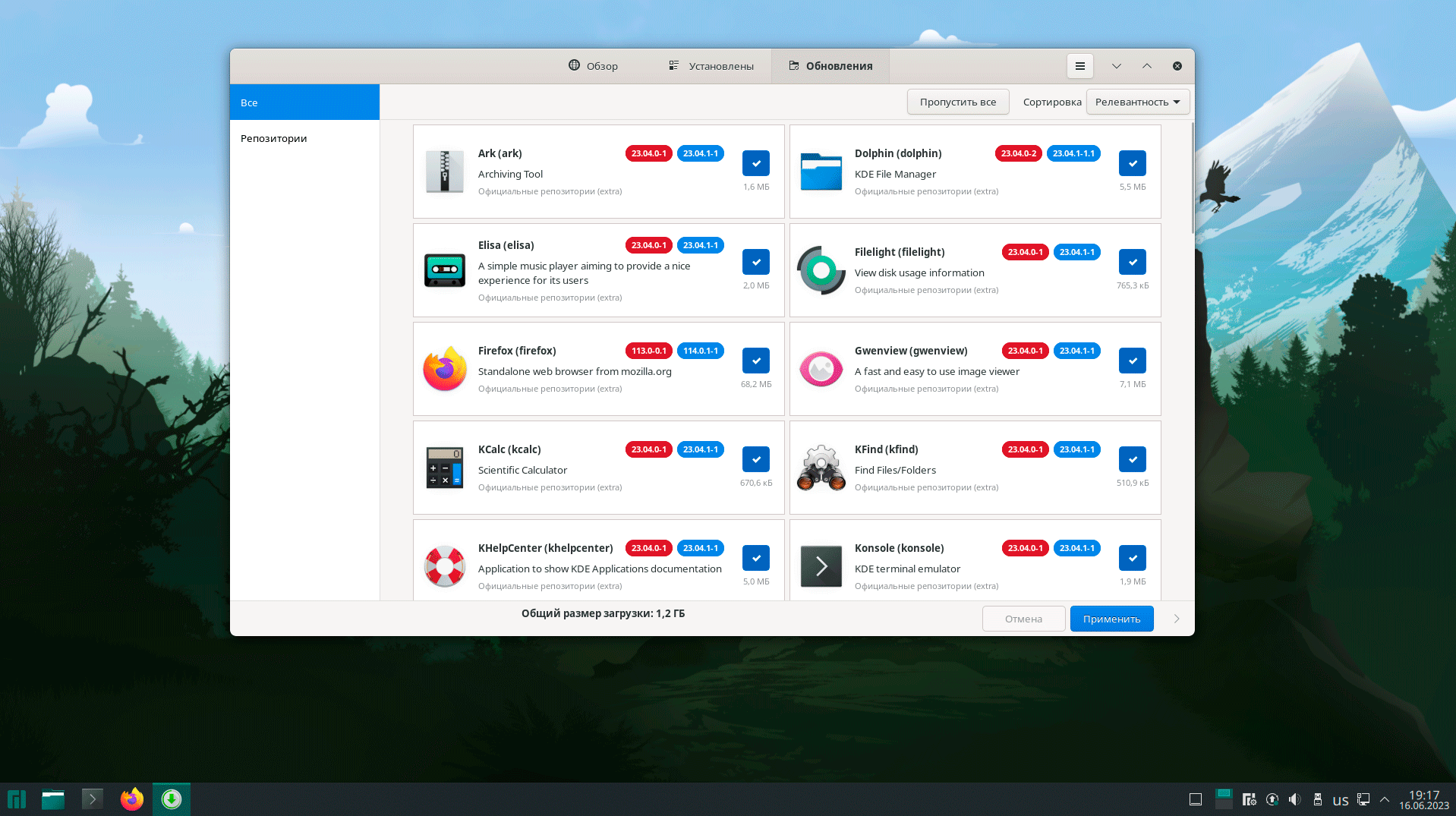 А вот дальше начинается интересное, система сообщает нам, что найдены обновления: ни много, ни мало - 1,2 ГБ, а это, между прочим, третья часть объема дистрибутива, который был собран всего две с половиной недели назад. Вообще, устанавливая любой Arch-based дистрибутив к этому надо быть готовым, что обновлений будет много и они будут часто. Откладывать их тоже не рекомендуется, так как если продолжительно не обновлять систему, то потом с вероятностью близкой к 100% столкнетесь с ошибками обновления.