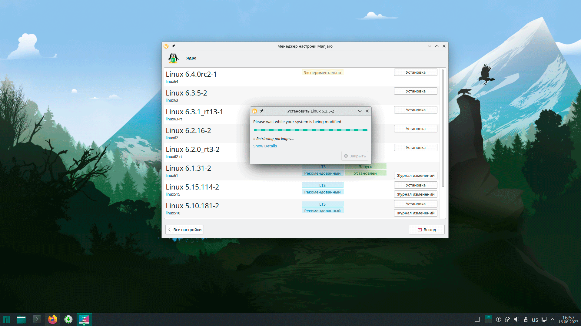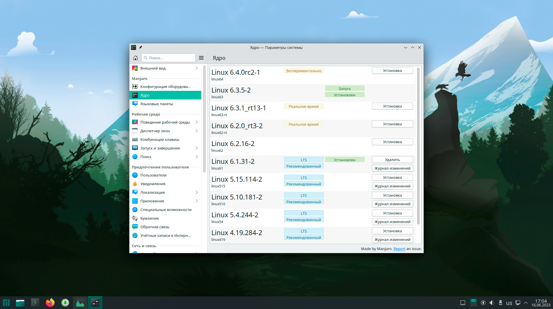 Очень удобно сделано управление ядрами, пользователь может легко выбирать, устанавливать и переключаться между разными версиями ядра Linux, выбор облегчают комментарии у каждого из вариантов. Ну так как мы на переднем крае прогресса, то переключимся со стабильного ядра 6.1 на последнее 6.3, при этом отметим, что автоматического обновления ядра при обновлении не произошло, хотя потом система сообщила нам, что доступно более свежее ядро.