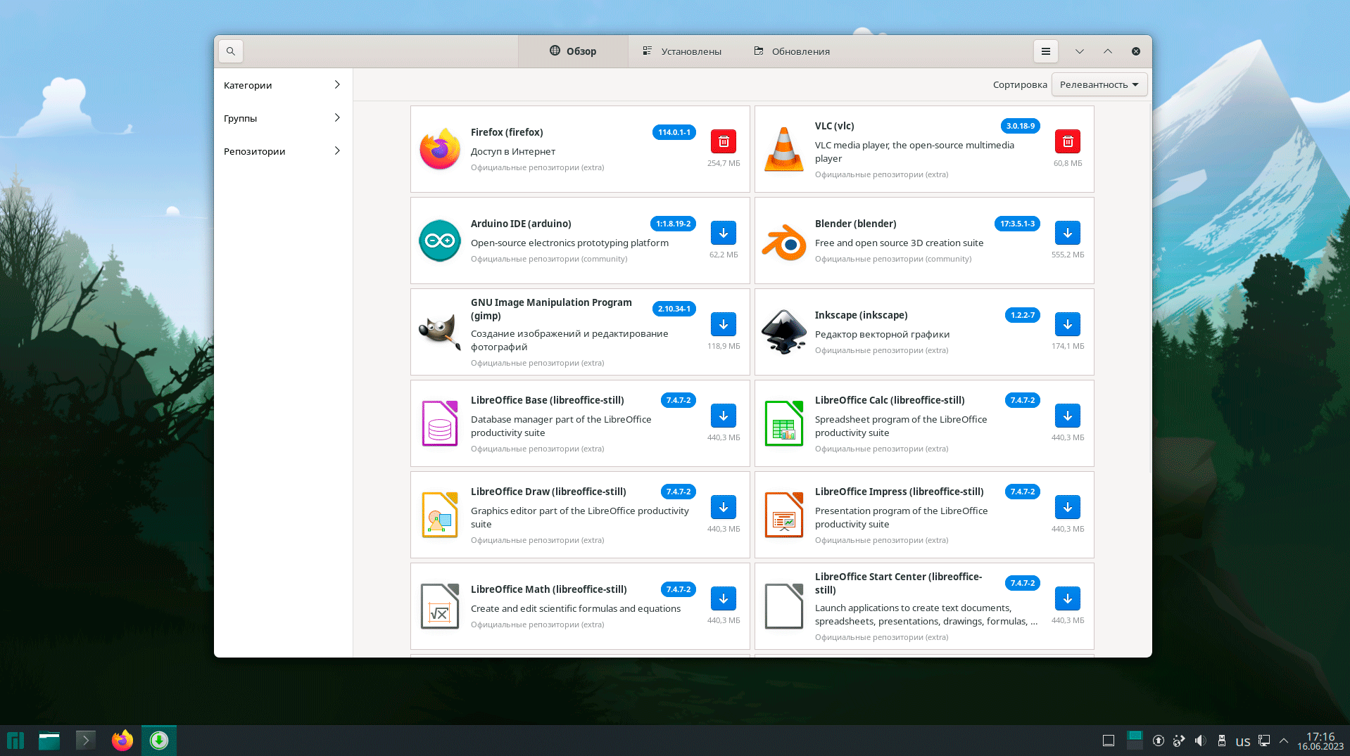 Для работы с программным обеспечением предназначен графический менеджер Pamac, который также является частью системы и отвечает всем современным требованиям к данному виду ПО, по умолчанию предлагается софт из родного репозитория Manjaro.