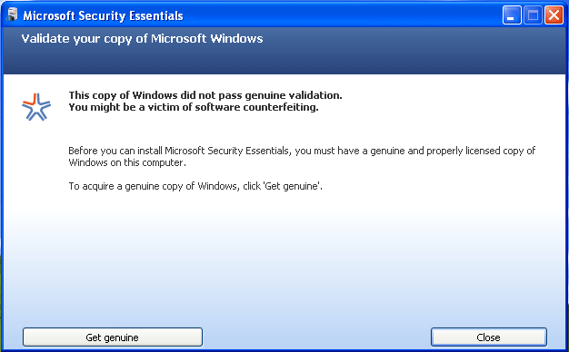 Security Essentials доступен для свободного скачивания в трех версиях: 32-бит для Windows XP, 32-бит и 64-бит для Windows Vista / Seven (скачать), к сожалению русская версия пока недоступна. Обращает внимание непривычно маленький размер инсталляционного файла: 8,61 Мб для XP и 4,28 / 4,71 Мб для 32 / 64 бит версии под Vista / Seven. Сразу хочется огорчить владельцев пиратских копий Windows, программа проводит проверку подлинности ОС и устанавливается только при ее успешном прохождении.