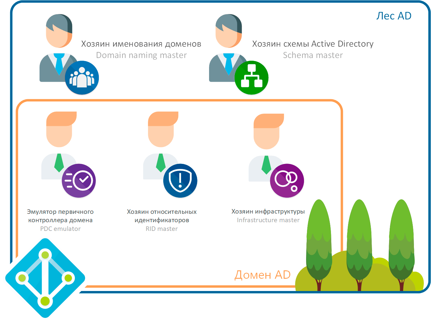 Напомним, что существуют пять ролей FSMO: две - уровня леса (уникальны в пределах леса) и три - уровня домена (уникальны для каждого домена). Для лучшей наглядности мы подготовили следующую инфографику, где указали как русские, так и английские названия хозяев: