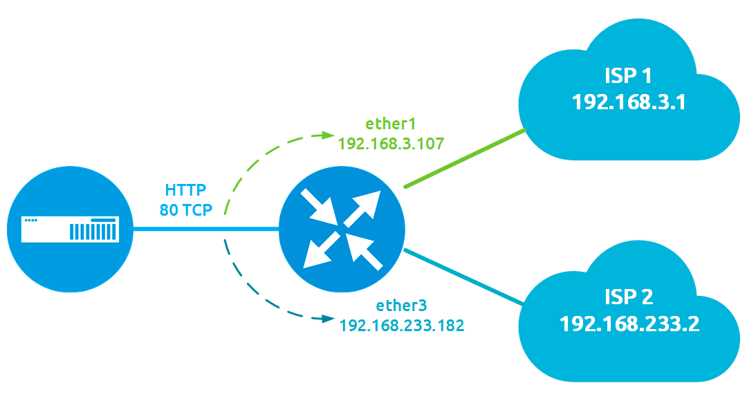 Как мы уже говорили выше при балансировке важно исключить из нее входящие соединения на проброшенные порты, так как ответ должен уходить в тот же канал, что и пришел запрос. Это можно сделать разными способами, чаще всего трафик маркируют по интерфейсу входа, но в этом случае в него попадает весь входящий трафик, в т.ч. и предназначенный роутеру, что заставляет вводить дополнительные правила для маркировки таких соединений. Но можно решить вопрос по-другому, более точечно.