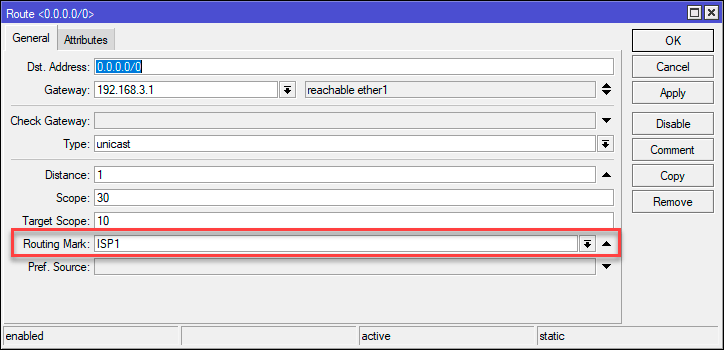 2add check-gateway=ping distance=1 gateway=192.168.3.1 routing-mark=ISP1