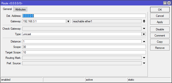 Все указанные ниже действия мы будем делать в IP - Routes, перейдем туда и сначала заполним основную (main) таблицу маршрутизации, которая будет использоваться по умолчанию, если никакая иная таблица не указана. Добавим маршрут к первому провайдеру: Dst. Address - оставляем по умолчанию - 0.0.0.0/0, Gateway - указываем шлюз первого провайдера, в нашем случае 192.168.3.1 и устанавливаем административную дистанцию маршрута - Distance - 1.