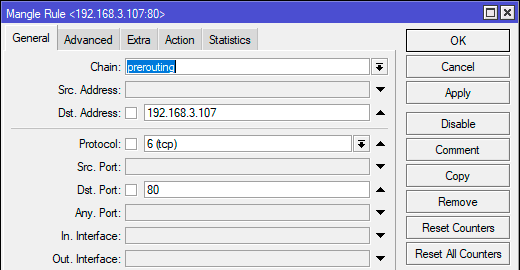 Переходим в IP - Firewall - Mangle и создаем следующее правило: Chain - prerouting, Dst Address - 192.168.3.107 - внешний адрес на канале первого провайдера, Protocol - tcp, Dst. Port - 80. Если проброшено несколько портов, то просто перечисляем их через запятую. В результате у вас должно получиться два правила, одно для протокола TCP, второе для UDP.