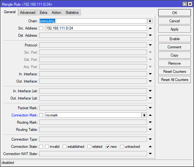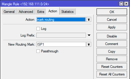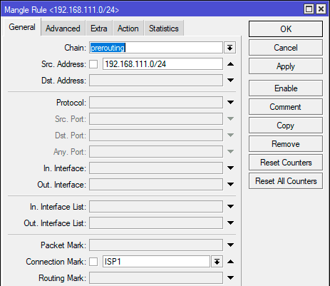 Соединения мы промаркировали, теперь нужно направить трафик в нужные таблицы маршрутизации, поэтому ниже создадим следующее правило: Chain - prerouting, Src/ Address - 192.168.111.0/24, Connection Mark - ISP1-IN.