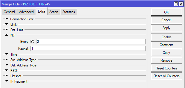 Затем переходим на закладку Extra и в разделе Nth ставим Every 2, Packet 1 - это означает что под условия будет попадать каждый первый пакет из двух.