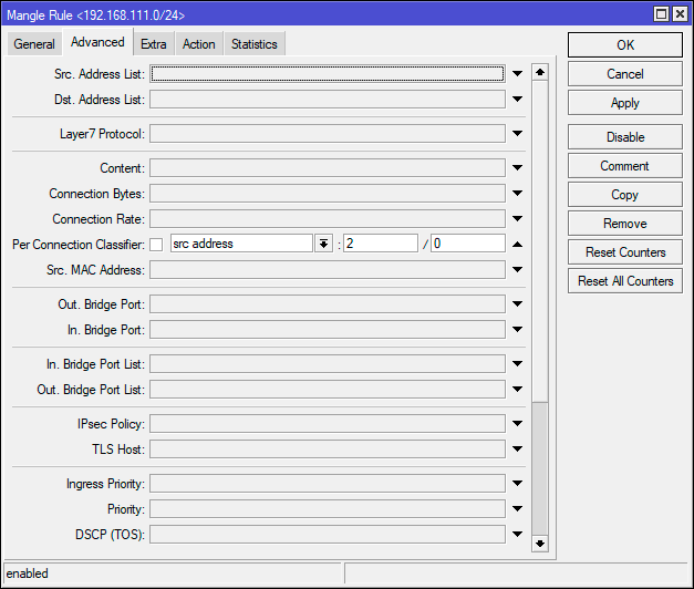 Начнем. Прежде всего добавим правило маркировки соединений, маркировать мы все также будем трафик с адресами источника Src. Address - 192.168.111.0/24 и не имеющих других марок Connection Mark - no mark. Только на закладке Advanced добавим критерий Per Connection Classifer - src. address 2/0.