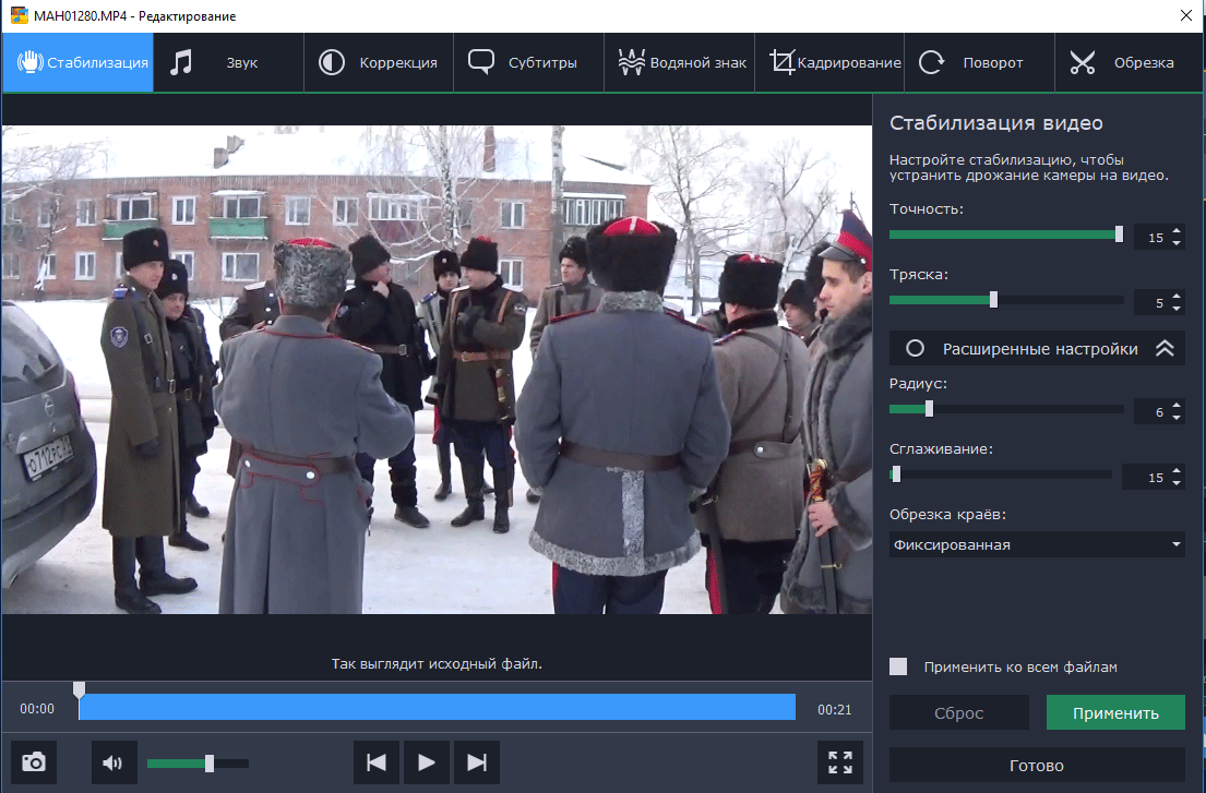 Мы специально взяли видео не самого высокого качества отснятое с рук и применили к нему Стабилизацию, так как местами изображение сильно дрожало. При необходимости ролик легко можно подрезать, удалив ненужные части.