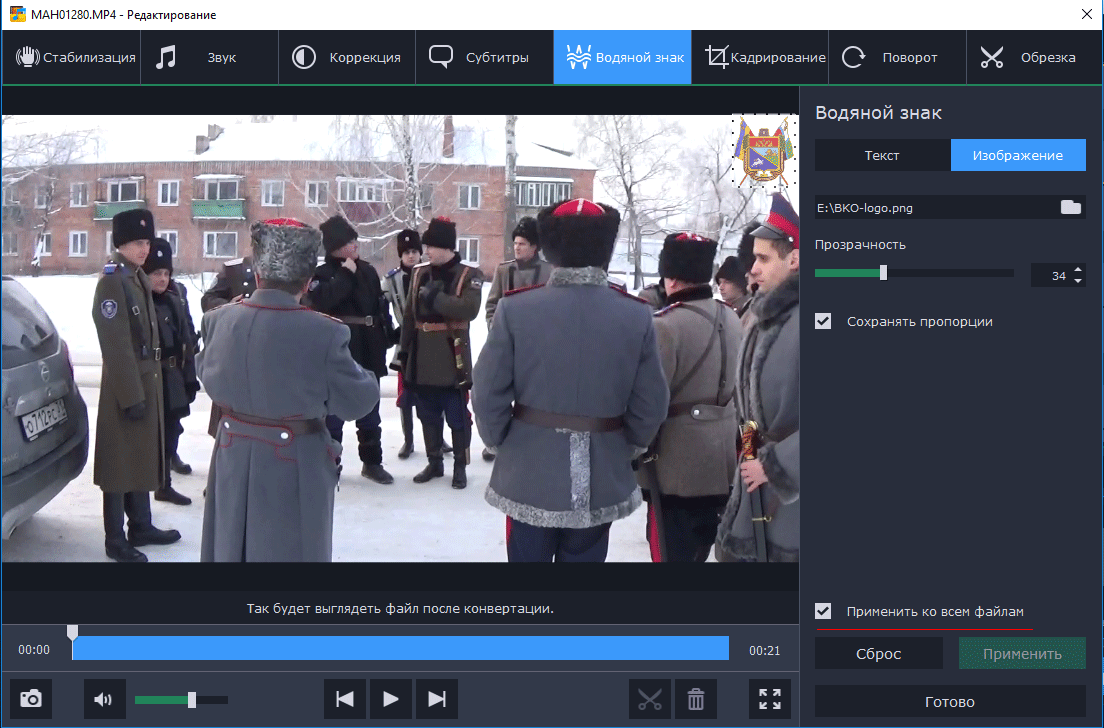 Результат обработки нас порадовал, видео стало выглядеть намного лучше. Но это только начало. Добавив сразу несколько роликов, мы можем применить к ним все действия как порознь, так и одновременно, скажем наложив на все сразу водяной знак.