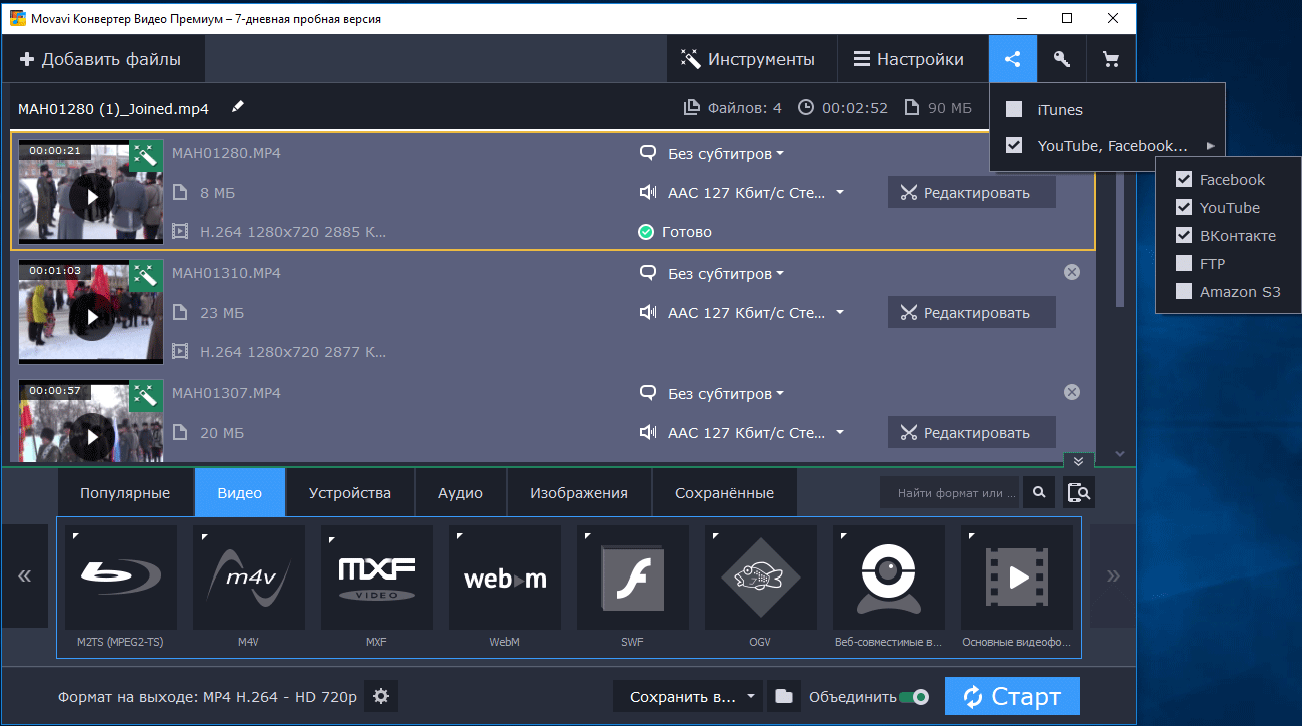 Кроме того, конвертер (если его уместно так называть) может помочь вам сразу разместить ролики на популярных видеохостингах и соцсетях, правда для этого потребуется установка дополнительного ПО, но при наличии сети это будет сделано автоматически.