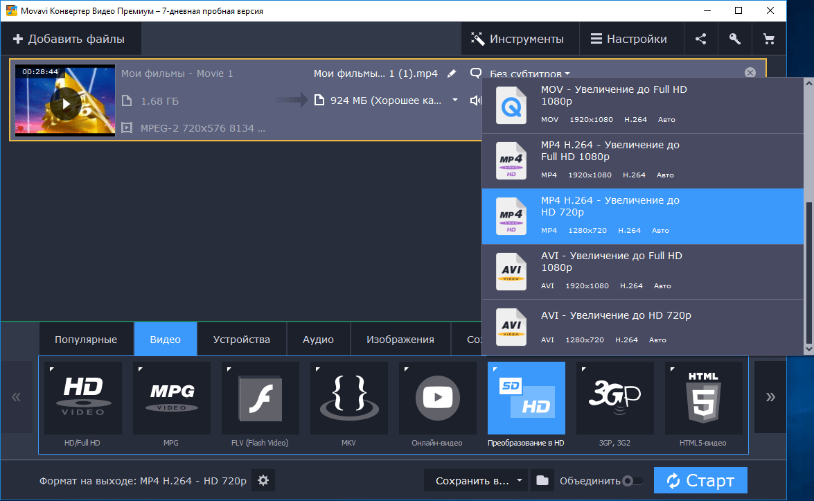 Мы выбрали одну из них: MP4 H.264 Увеличение до HD 720p и результат нас порадовал. Ниже приведены образцы видео до и после конвертации, проигрывание производилось при помощи VLC-плеера на экране монитора с разрешением 1920 x 1080.