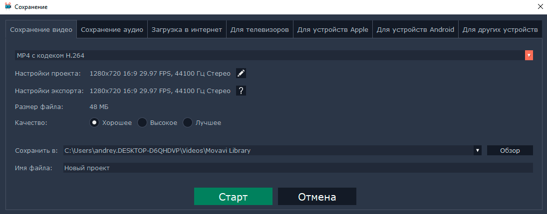 Вы можете еще раз настроить формат и качество видео и аудио, оптимизировать его для устройств и телевизоров, либо сразу выложить результат на YouTube.
