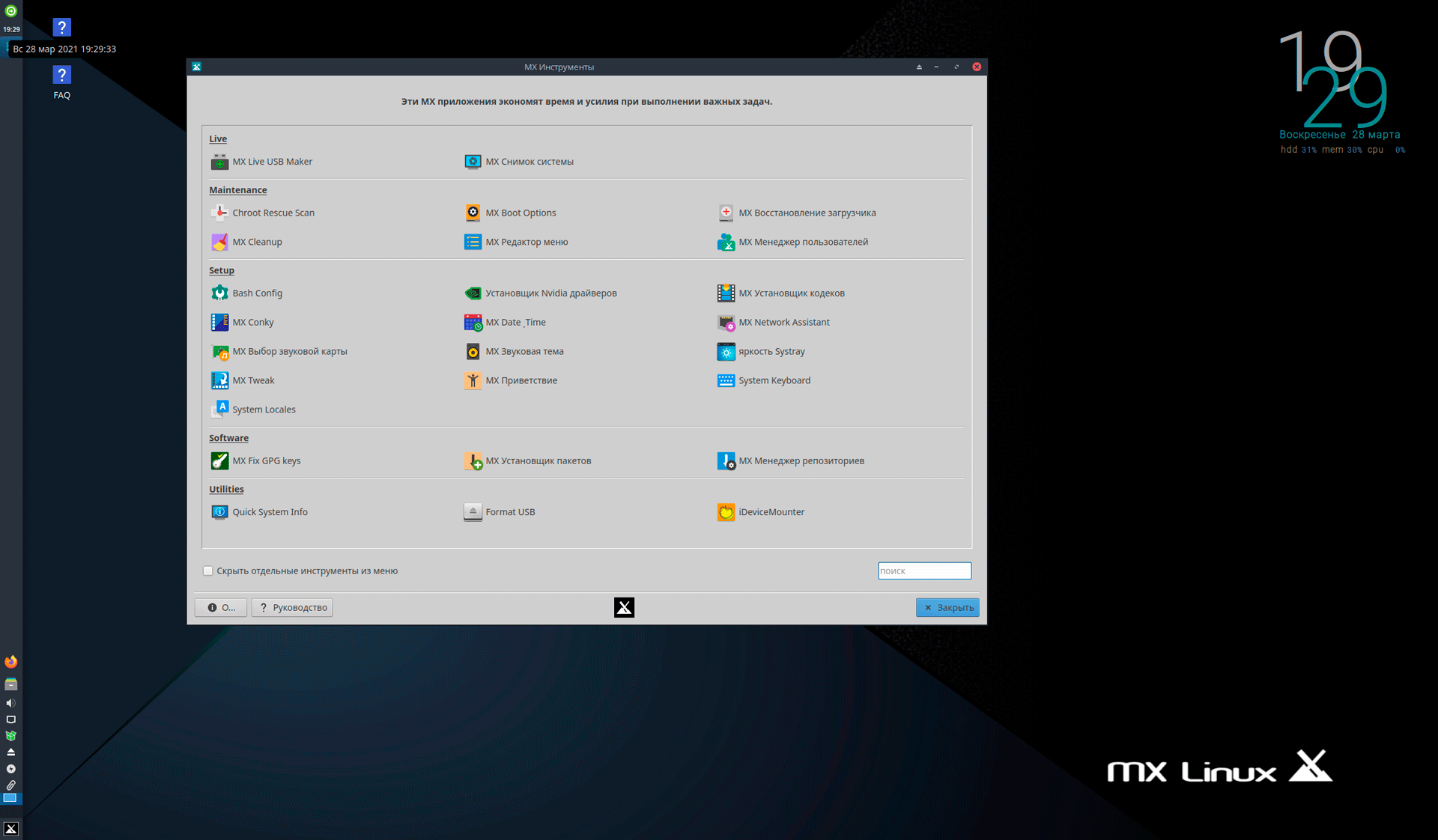 Основной фирменной особенностью дистрибутива являются MX-инструменты - набор утилит собственной разработки, упрощающих настройку системы в графическом режиме.