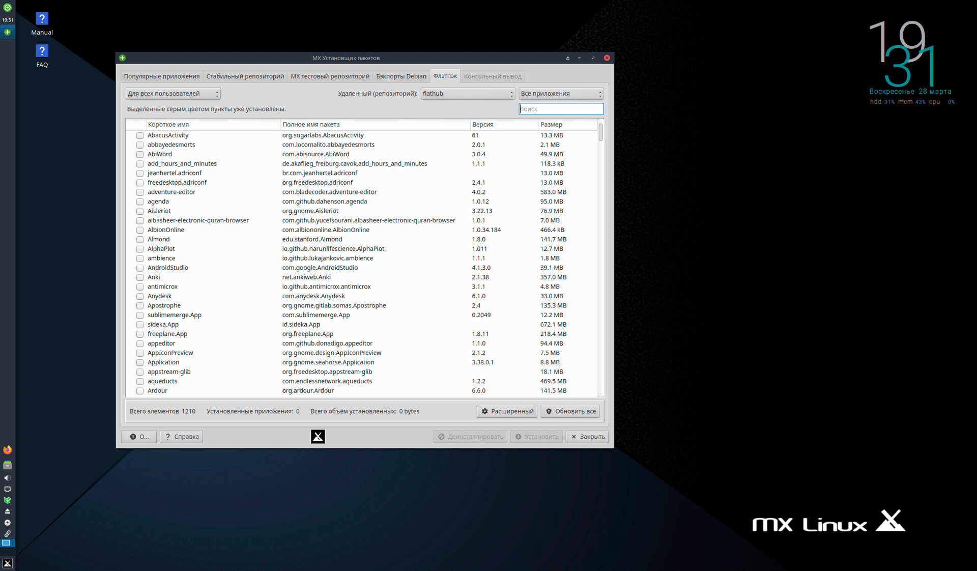 Здесь же возможен выбор установки пакетов из нескольких источников, доступны различные репозитории, в том числе Flatpak. Можно по-разному относится к подобным источникам, но следует признать, что их использование для простых пользователей, желающих иметь самые свежие версии ПО, более безопасны, чем прочие альтернативы. А там каждый сам вправе решать, что именно ему использовать.