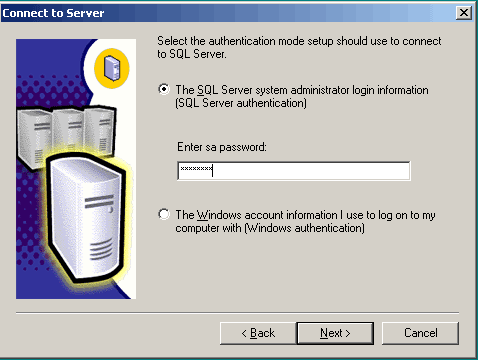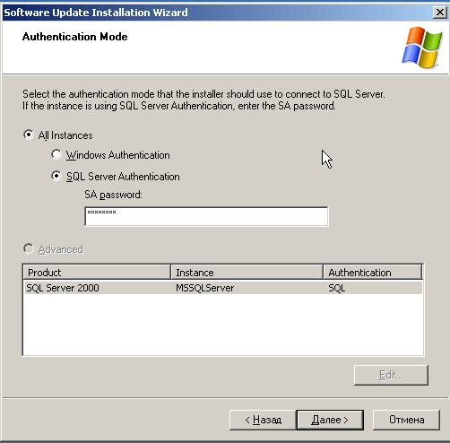 После установки SP4 обязательно требуется установить исправление KB899761 (скачать) исправляющее медленную работу и неполную загрузку памяти SQL сервером. При установке исправления также необходимо указать авторизацию через sa с вводом пароля.