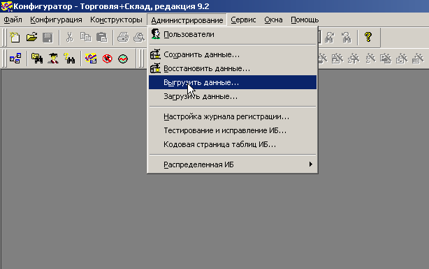 Теперь, когда SQL сервер установлен и готов к использованию необходимо настроить 1С Предприятие. Напомним, что для работы с SQL сервером необходима отдельная версия 1С для SQL. Для успешной работы с SQL сервером в базе 1С должен быть заведен хотя бы один пользователь. Далее загружаем целевую базу в конфигуратор и производим выгрузку данных через Администрирование - Выгрузить данные.