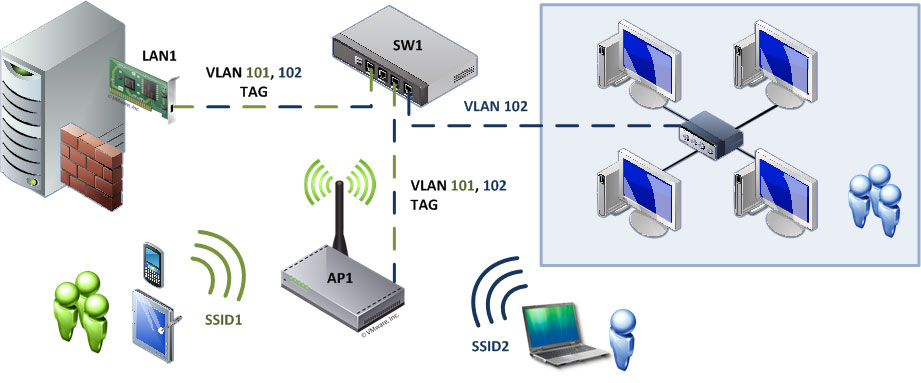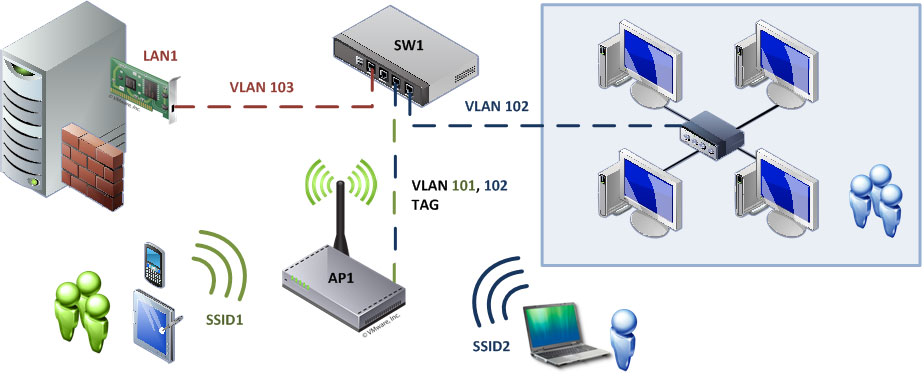 Таким образом точка доступа будет иметь две беспроводные сети на одном канале, одну открытую SSID1 для гостей и защищенную SSID2 для сотрудников. Пакеты передаваемые точкой в локальную сеть будут промаркированы VLAN-тегами и работать с ними сможет только оборудование с поддержкой IEEE 802.1Q, проще говоря, если между AP1 иSW1 окажется обычный свитч, то тегированые пакеты окажутся отброшены и схемаработать не будет.