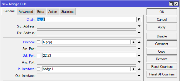 Начнем, перейдем в IP - Firewall - Mangle и создадим правило, в нем мы будем контролировать обращения на порты 22 и 23 - SSH и Telnet: Chain - input, Protocol - tcp, Dst. Port - 22,23, In. Interface - внутренний интерфейс, в нашем случае bridge1.