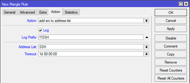 На закладке Action добавим действие - add src to address list и указываем список для адресов, например, SSH. В поле Timeout указываем срок пребывания адреса в листе, в нашем случае сутки. Такое время выбрано исходя из того, чтобы не засорять листы, которые мы будем отправлять на почту администратору раз в сутки. Также для последующего анализа включим запись события в лог, для чего присвоим ему собственный префикс !!!SSH.