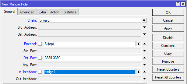 Вот с RDP мы и начнем. Снова возвращаемся в IP - Firewall - Mangle и создаем правило: Chain - forward, Protocol - tcp, Dst. Port - 3389,3390, In. Interface - bridge1.