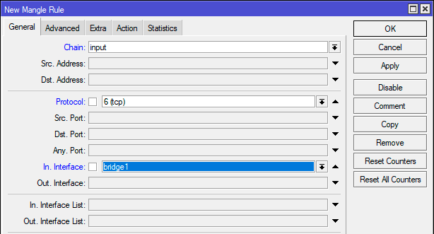 Отдельно стоит упомянуть про сканирование портов, RouterOS имеет собственные инструменты для выявления сканирования, для этого создадим правило: Chain - input, Protocol - tcp, In. Interface - bridge1.