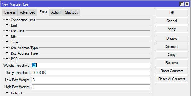 На закладке Extra развернем блок PSD, для начала можно оставить настройки по умолчанию, смысл их довольно прост: за 3 секунды сканирующий должен набрать 21 очко, за каждый "низкий" порт (0-1023) присваивается 3 очка, за каждый "высокий" (1024-65535) - одно очко.