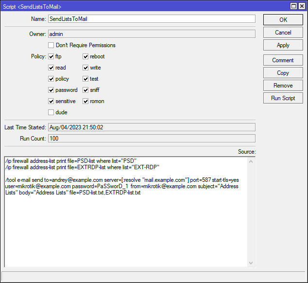 5 start-tls=yes user=mikrotik@example.com password=PaSSworD_1 from=mikrotik@example.com \