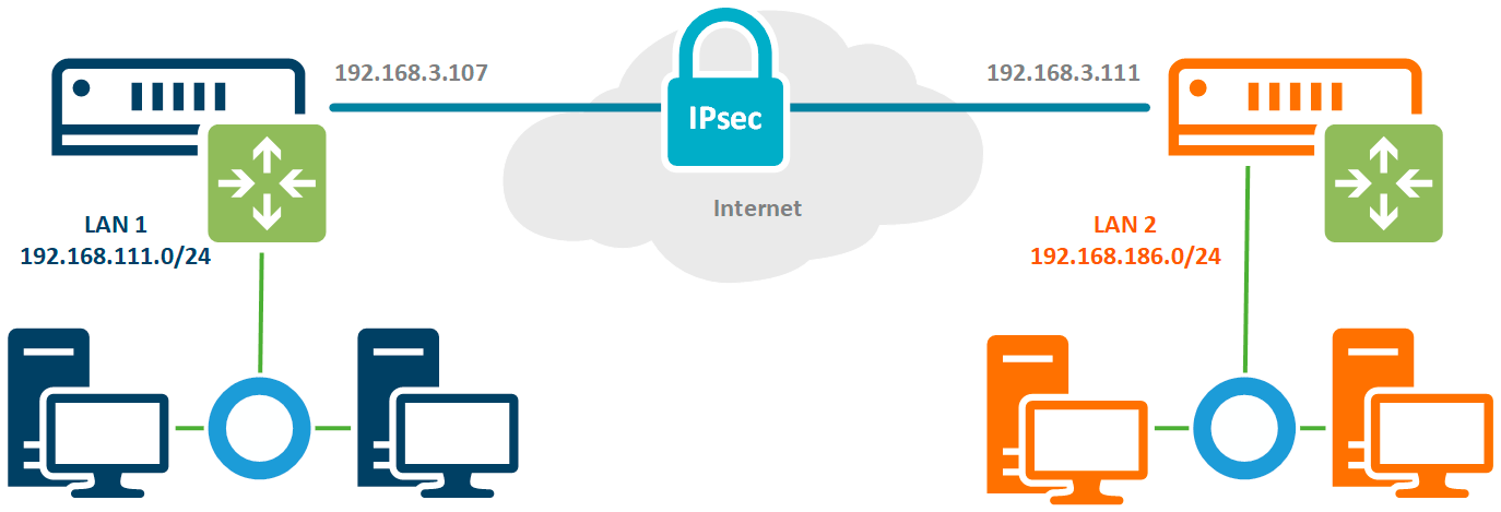 Где LAN 1 с диапазоном 192.168.111.0/24 и LAN 2 - 192.168.186.0/24 - это сети двух офисов, которые мы будем объединять, а 192.168.3.107 и 192.168.3.111 - выполняют роль внешних белых адресов в сети интернет. Наша задача обеспечить прозрачный доступ устройств одной сети в другую через защищенный канал связи.