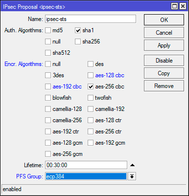 Вторая фаза - установление защищённого соединения и передача данных, настройки шифров для нее задаются в IP - IPsec - Proposal, перейдем в данный раздел и создадим новое предложение. Укажем Auth. Algorithms - sha1, Encr. Algorithms - aes-256-cbc, PFS Group - ecp384.