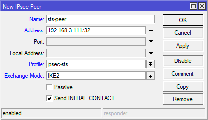 Теперь перейдем в IP - IPsec - Peer и создадим новое подключение. В поле Address указываем внешний адрес второго роутера, в Profile выбираем созданный нами на предыдущем этапе профиль, в нашем случае ipsec-sts, а в поле Exchange Mode указываем IKE2.